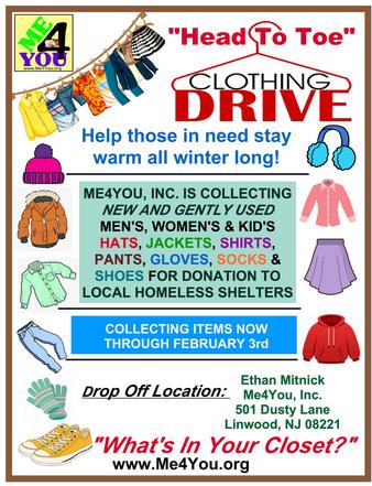 In an effort to help those in need stay warm this winter, Me4you collected over 1,300 pieces of new and gently used men's, women's and kid's hats, jackets, shirts, pants, gloves, socks and shoes for donation to a local homeless shelter.